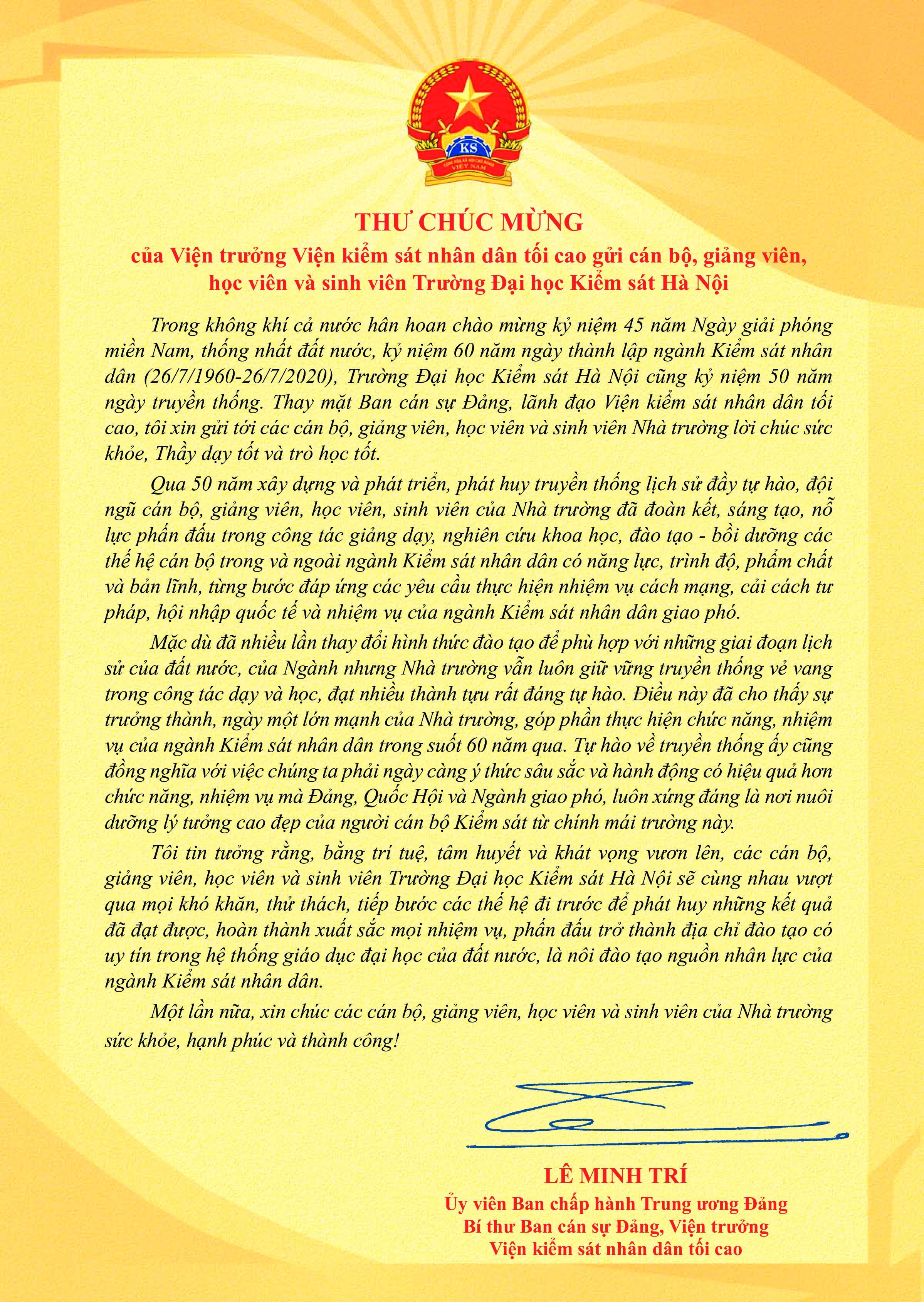 Thư chúc mừng của Đồng chí Lê Minh Trí - Ủy viên Ban chấp hành Trung ương Đảng, Bí thư Ban cán sự Đảng, Viện trưởng Viện kiểm sát nhân dân tối cao